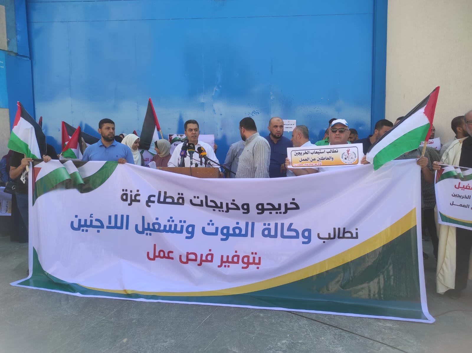 شارك وفد من الهيئة الدولية لدعم حقوق الشعب الفلسطيني “حشد”، اليوم الثلاثاء، في وقفة مطلبية أمام مبني وكالة الأمم المتحدة لاغاثة وتشغيل اللاجئيين الفلسطينين “أونروا”، لمطالبتها بدعم حقوق الخريجين من اللاجئين في الحصول على فرص عمل، وضمان قيامها بدورها في توفير برامج تشغيل للخريجين، ودعوة كل الجهات الحكومية والدولية والأهلية والقطاع الخاص لدعم حقوق الخريجين في إيجاد فرص عمل مؤقتة ودائمة ودعم مشاريع الشباب والنساء للحد من نسب البطالة والفقر وتعزيز صمود المواطنين في قطاع غزة.