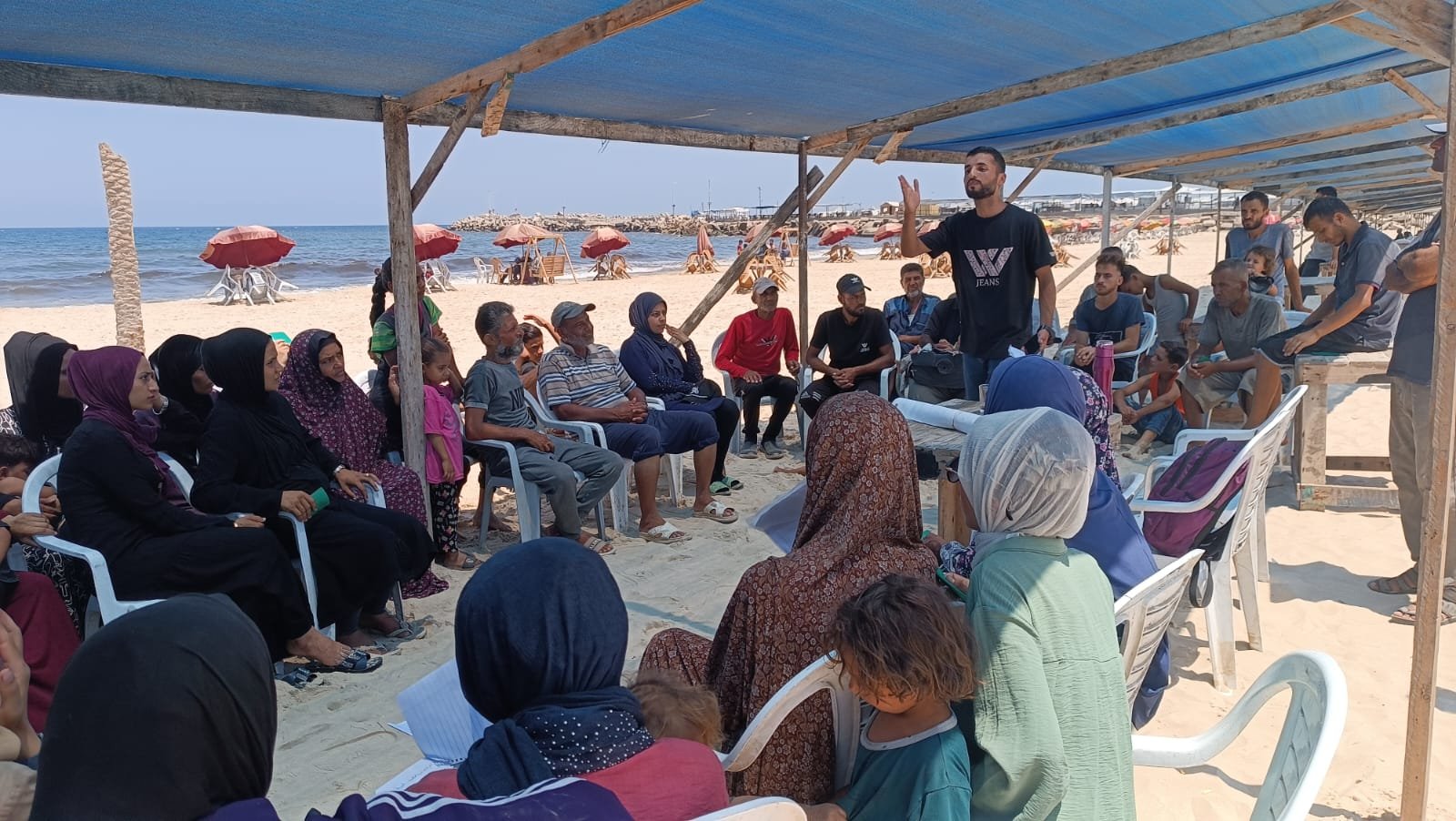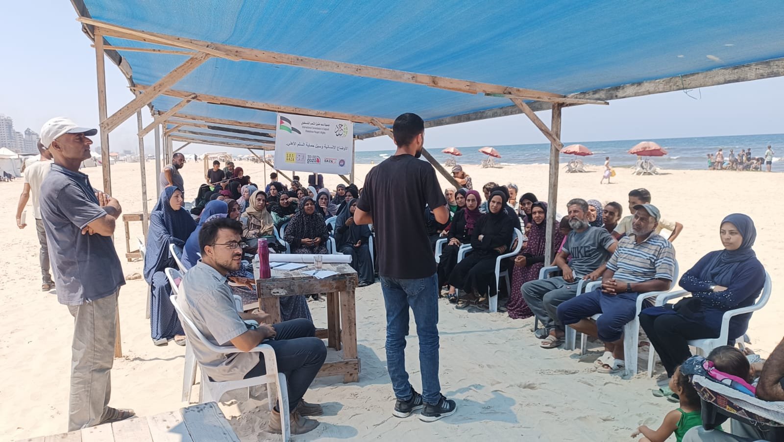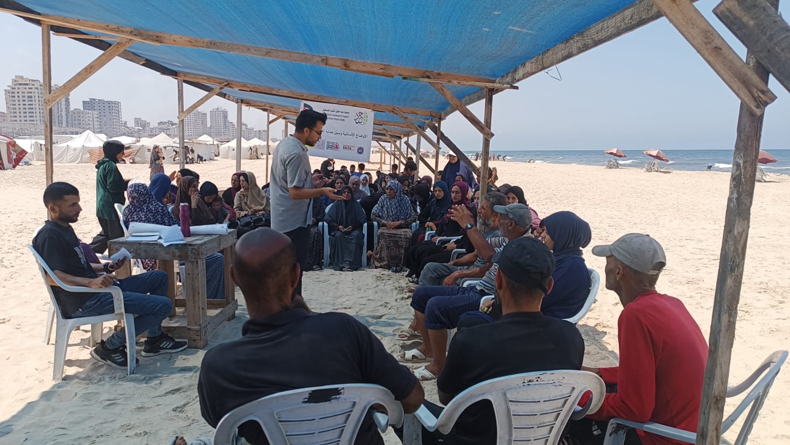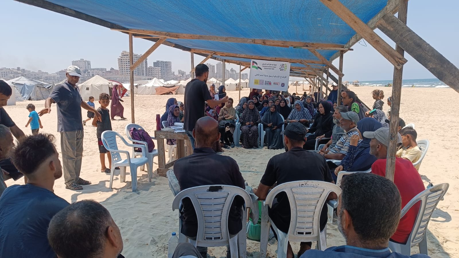نظمت الهيئة الدولية لدعم حقوق الشعب الفلسطيني “حشد”، أمس الأحد، ورشة عمل بعنوان “الاستجابة الإنسانية وحماية السلم الأهلي”، في إحدى الخيام المقامة على شاطئ بحر غزة، والتي تؤوي نازحين من مناطق متفرقة من قطاع غزة جرّاء العدوان الإسرائيلي المستمر.