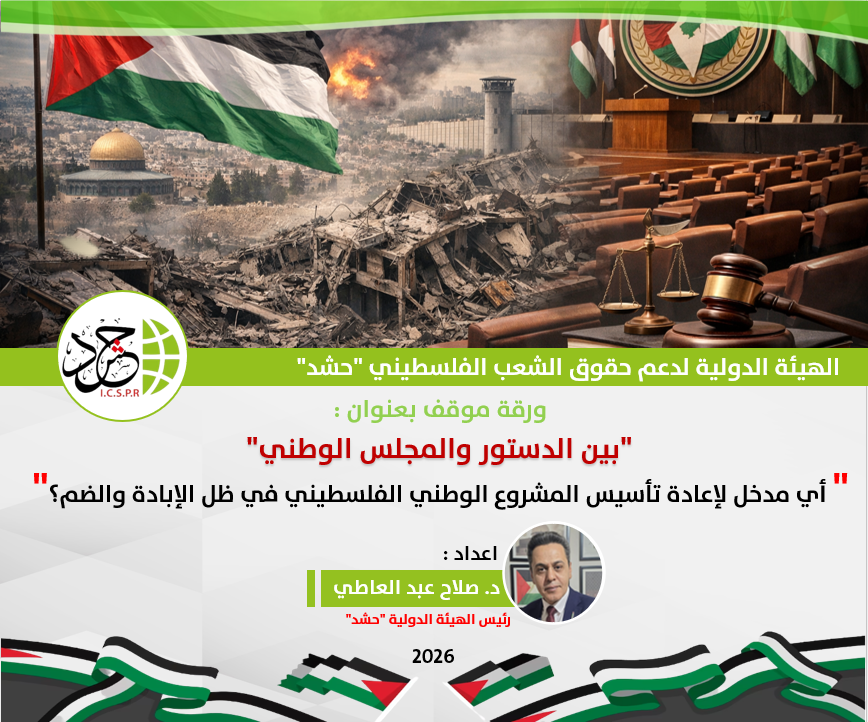 أصدرت الهيئة الدولية لدعم حقوق الشعب الفلسطيني – حشد، ورقة موقف شاملة بعنوان: «مسودة الدستور المؤقت والانتخابات للمجلس الوطني: أي مشروع وطني نريد في ظل الإبادة والضم الاستعماري؟»، أعدها رئيس الهيئة، د. صلاح عبد العاطي، تناولت التحليل السياسي والدستوري والحقوقي لمسودة الدستور وأولويات إعادة بناء النظام السياسي الفلسطيني.