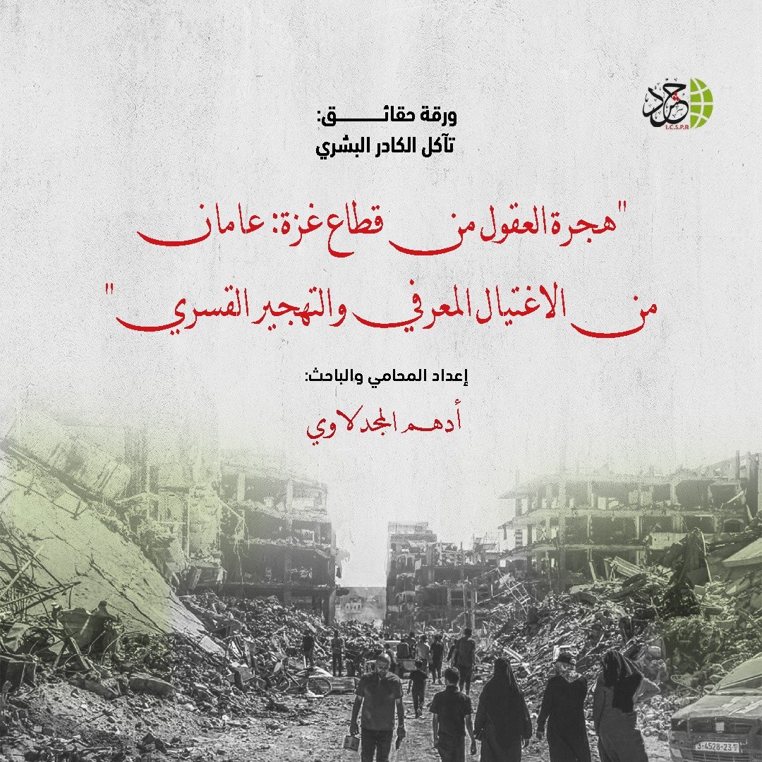 أصدرت الهيئة الدولية لدعم حقوق الشعب الفلسطيني – حشد ورقة حقائق جديدة بعنوان: «تآكل الكادر البشري: هجرة العقول من قطاع غزة – عامان من الاغتيال المعرفي والتهجير القسري»، أعدّها المحامي والباحث أدهم المجدلاوي، وتناولت بالتحليل والتوثيق سياسة استهداف الكفاءات الفلسطينية خلال حرب الإبادة الجماعية المستمرة منذ أكتوبر 2023، وانعكاساتها البنيوية على مستقبل المجتمع الفلسطيني.