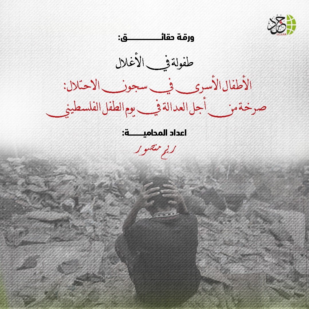 أصدرت الهيئة الدولية لدعم حقوق الشعب الفلسطيني – حشد، ورقة حقائق بعنوان: “طفولة في الأغلال: الأطفال الأسرى في سجون الاحتلال.. صرخة من أجل العدالة في يوم الطفل الفلسطيني”، من إعداد المحامية ريم منصور، سلّطت الضوء على الواقع المأساوي الذي يعيشه الأطفال الفلسطينيون داخل سجون الاحتلال، وما يتعرضون له من انتهاكات جسيمة تمس طفولتهم وحقوقهم الأساسية.