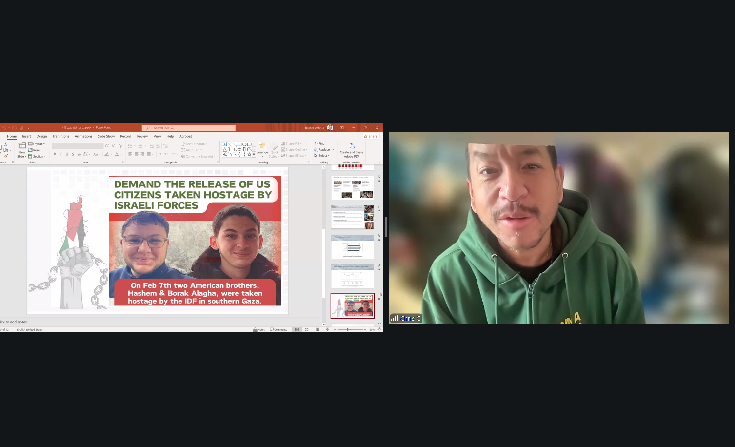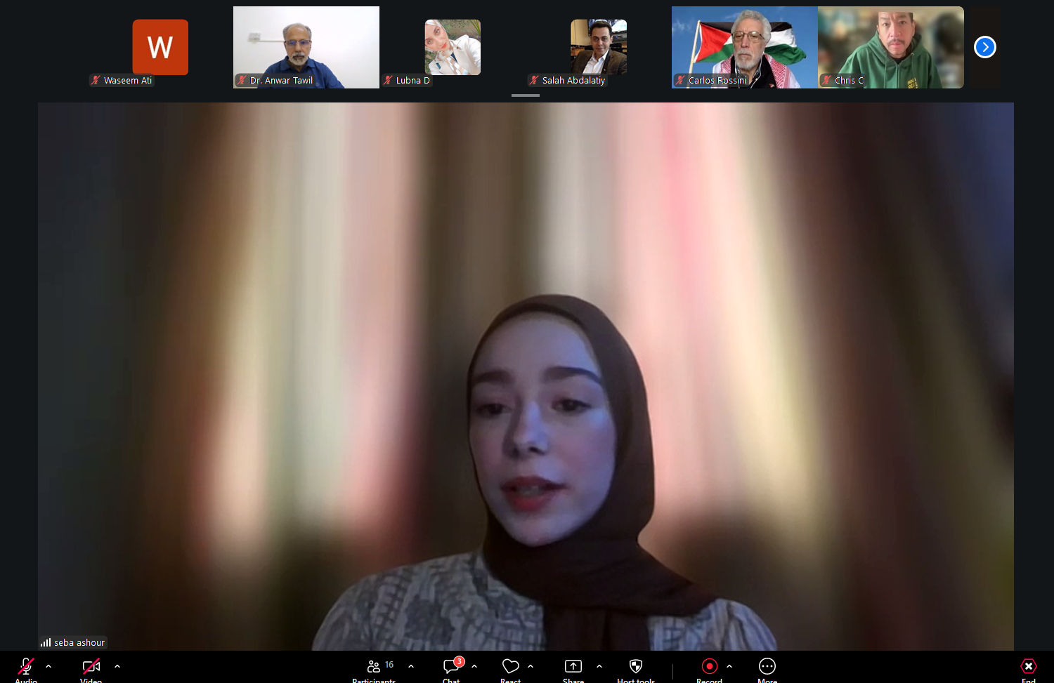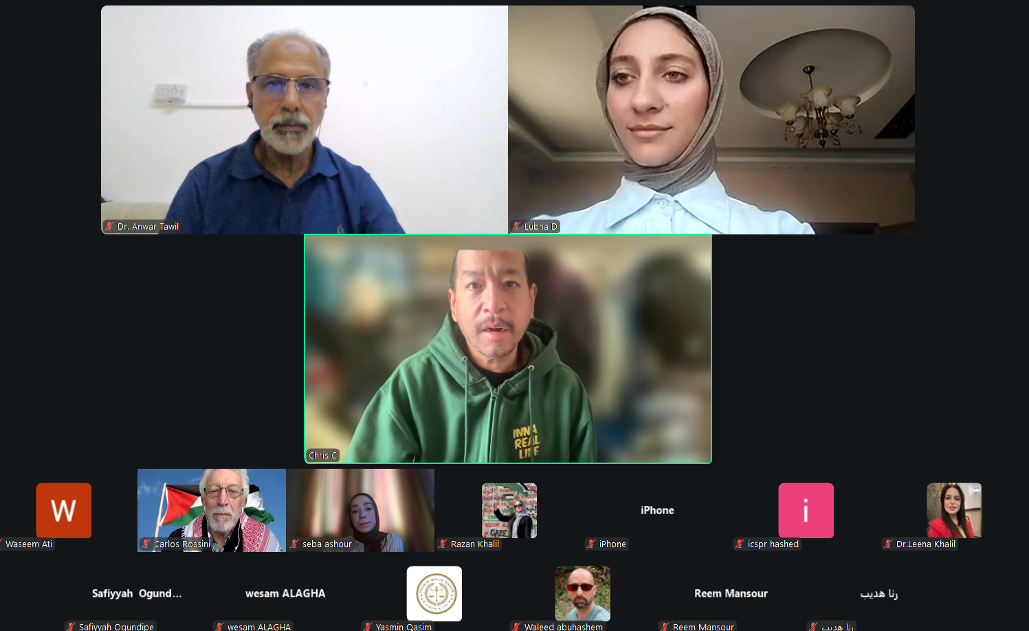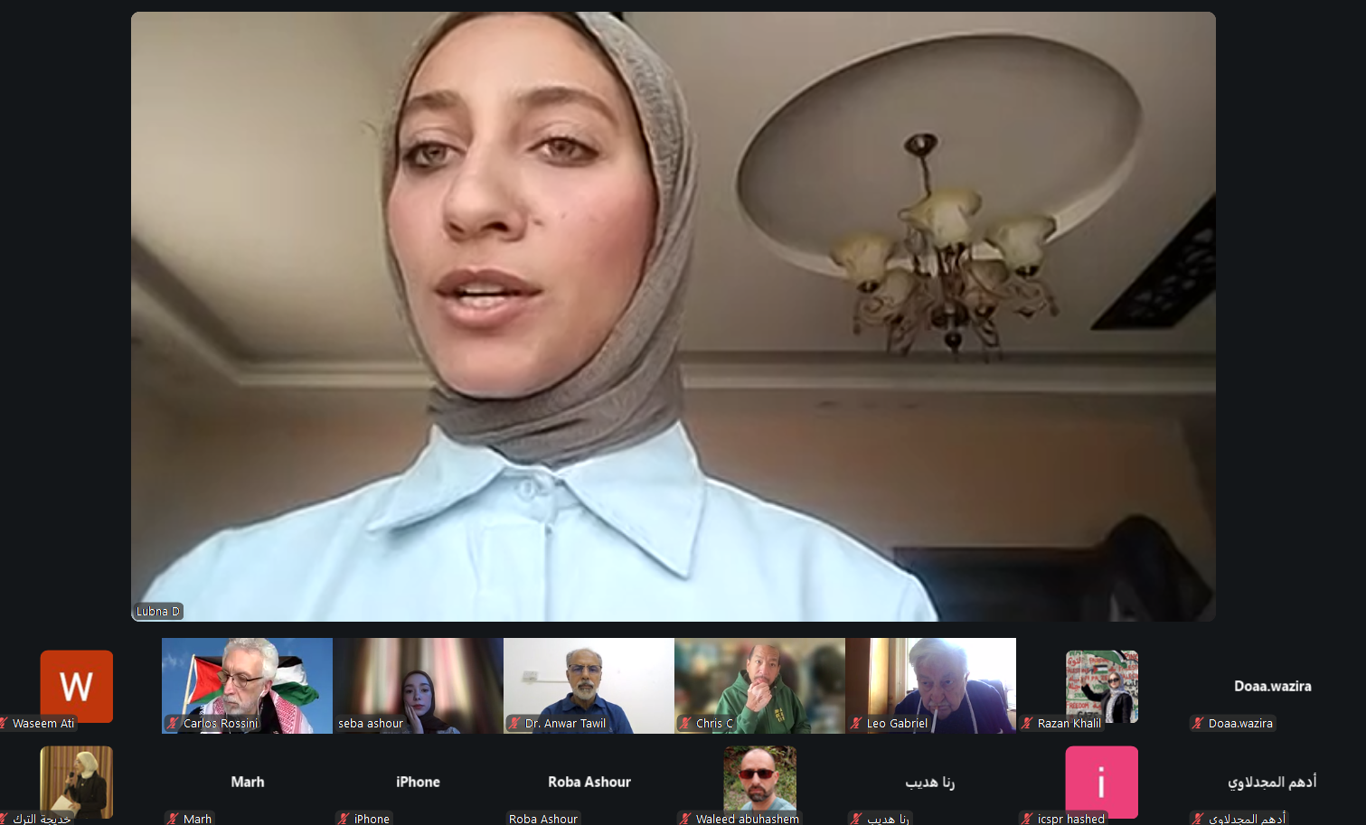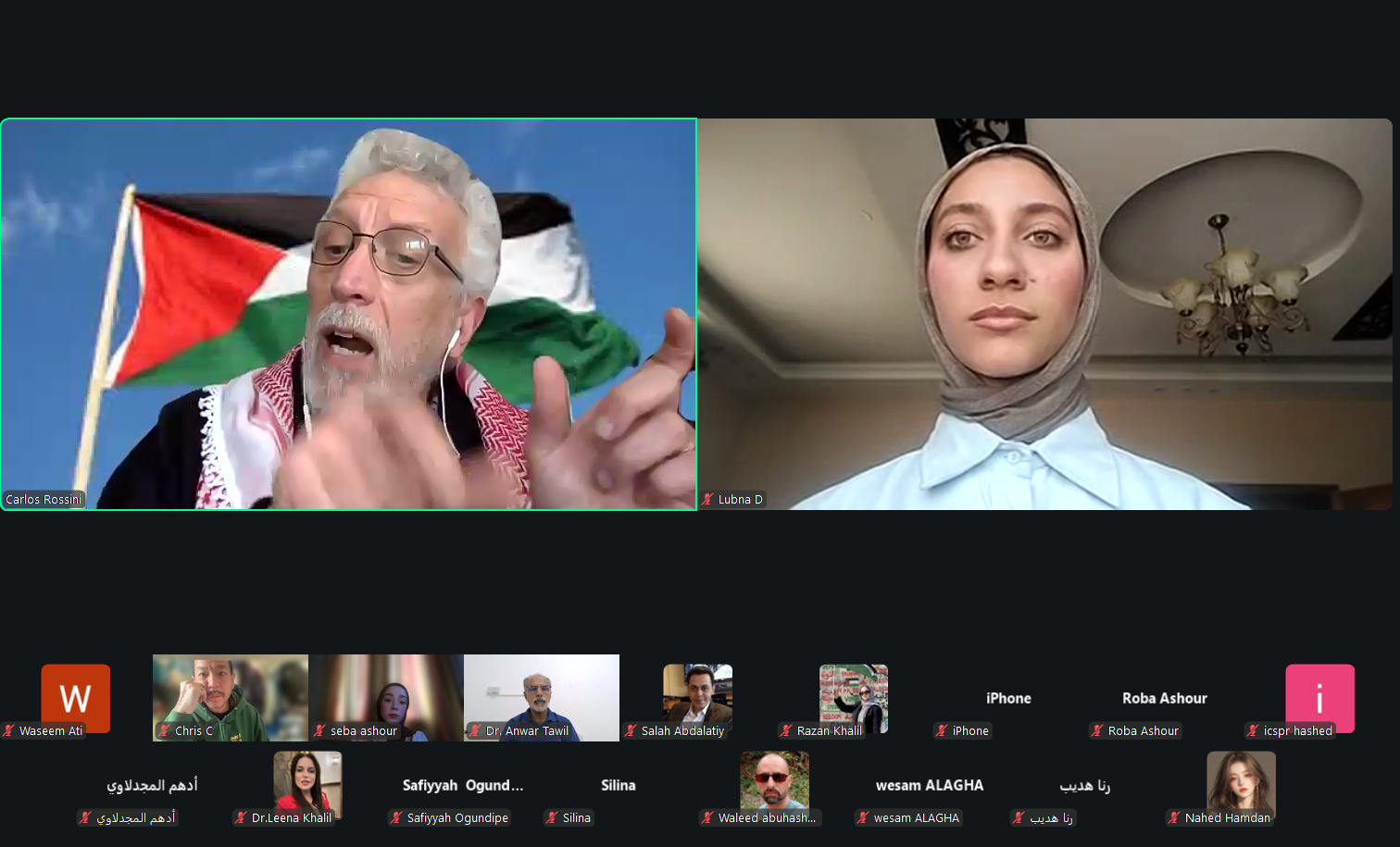 واستهلّ اللقاء بجانب تنسيقي وتقني لضمان جاهزية العرض التقديمي وسير الجلسة بصورة سليمة، حيث جرى التنسيق بين المشاركين حول مشاركة المواد والعروض، وضبط إعدادات الفيديو والعرض داخل منصة زووم، بما يضمن جودة الاتصال وانطلاق الجلسة الرئيسية بعد معالجة الجوانب التقنية الأساسية. كما شهدت بداية اللقاء كلمات ترحيبية متبادلة بين المشاركين، من بينهم الدكتور أنور الذي انضم من سلطنة عُمان، في أجواء أكدت أهمية هذا اللقاء الحقوقي والإنساني المخصص لقضية الأسرى الفلسطينيين.