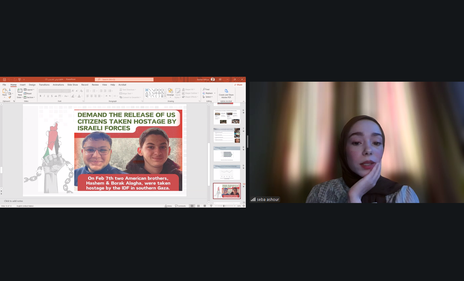 وقدّمت صبا عاشور، الناشطة الشبابية في الهيئة الدولية لدعم حقوق الشعب الفلسطيني، مداخلة محورية استعرضت فيها حالة الشقيقين براء وهاشم الأعرج من ولاية إلينوي الأميركية، وهما يحملان الجنسيتين الأميركية والكندية، واللذين تم احتجازهما من قبل القوات الإسرائيلية في غزة في فبراير/شباط 2024، رغم معاناتهما من أوضاع صحية صعبة وقت الاعتقال. وأوضحت أن الشقيقين لا يزالان، بحسب ما طُرح في الورشة، رهن الاحتجاز من دون توجيه تهم رسمية، وفي ظروف قاسية شملت الاعتداء الجسدي، وغياب الرعاية الطبية الكافية، والحرمان من الوصول القانوني، بما يثير مخاوف جدية من وقوع انتهاكات جسيمة للقانون الدولي الإنساني والقانون الدولي لحقوق الإنسان.